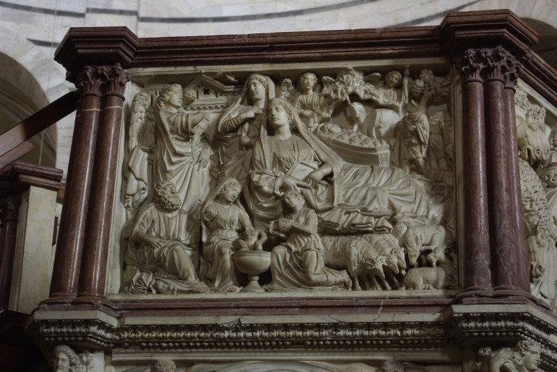 Dans le baptistère, la chaire est richement décorée.
