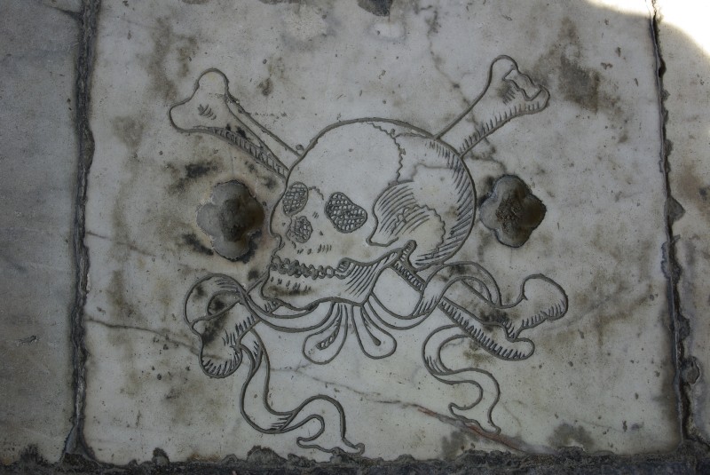 Gravure de pierre tombale. Le visage de la Mort ? Ou bien est-ce la tombe d'un pirate ?